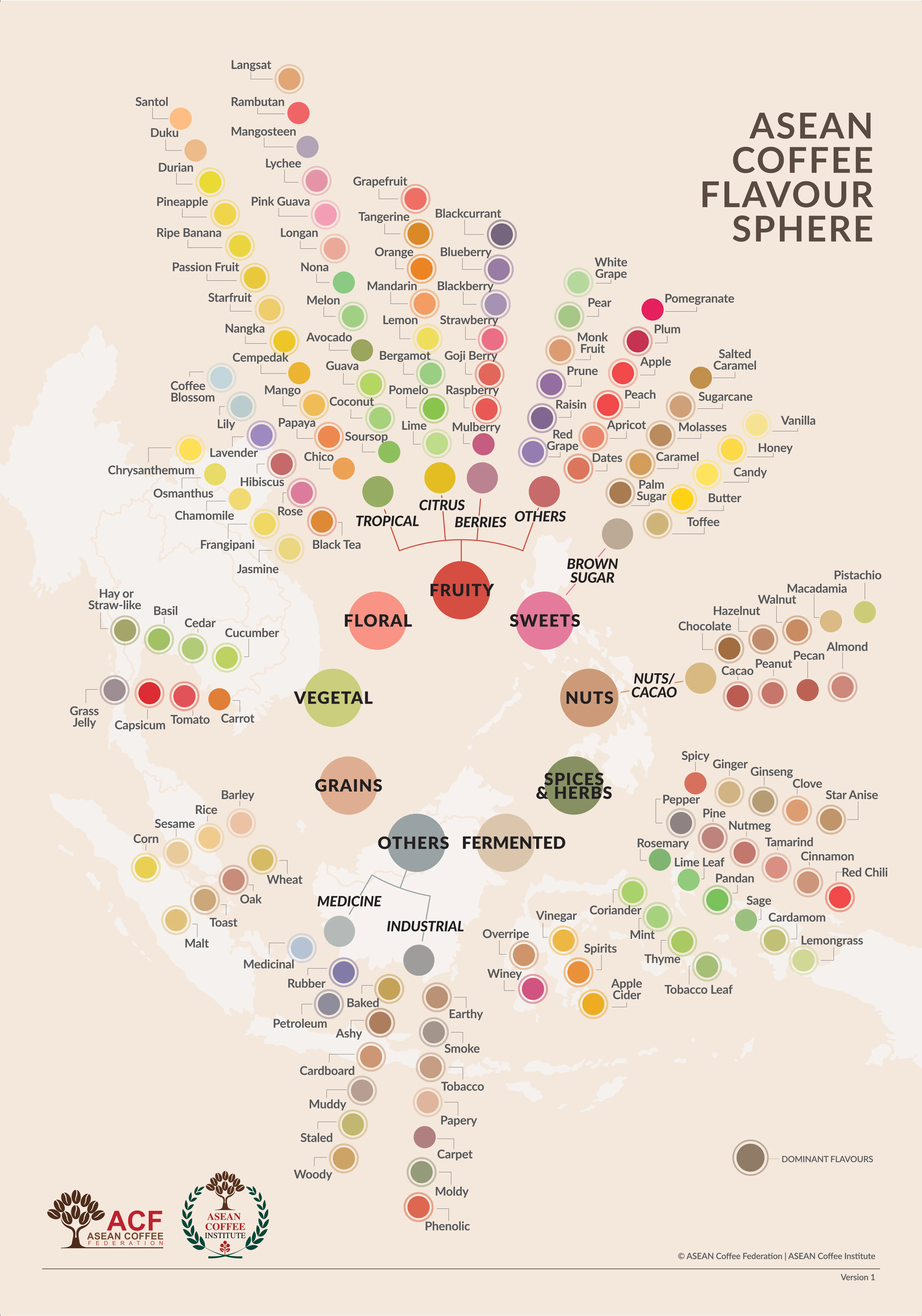 ASEAN Coffee Flavour Sphere là một bản đồ hương vị sử dụng trái cây, gia vị và nguyên liệu quen thuộc khắp châu Á