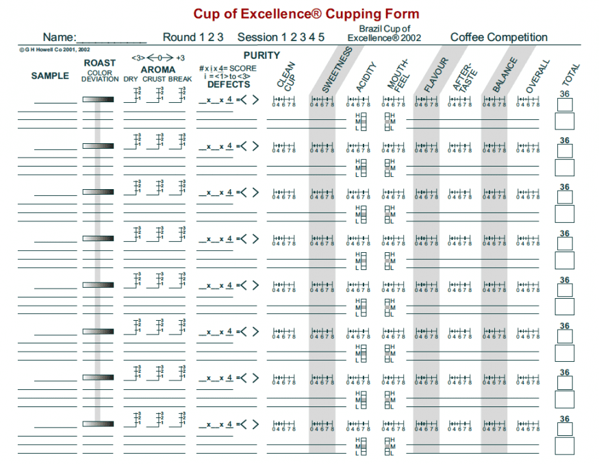 Biểu mẫu chấm điểm của Cup of Excellence đánh giá chất lượng cà phê dựa trên nhiều hạng mục quan trọng và theo biểu mẫu được làm riêng cho COE.